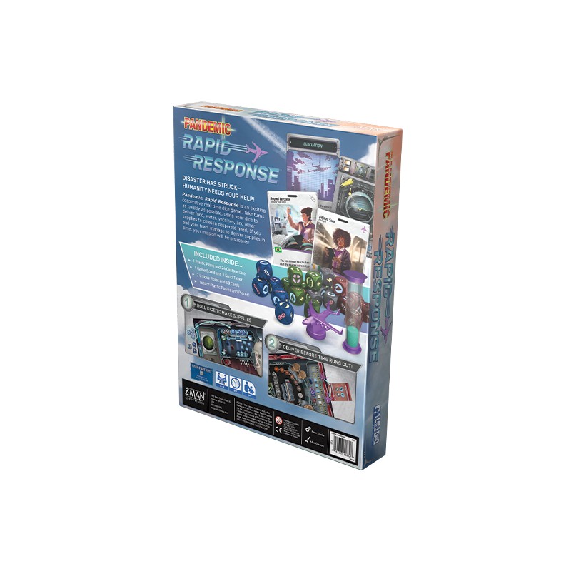 Pandemic: Rapid Response is a race against time. Roll dice to create supplies, fly the plane, and make deliveries to cities in need. As the timer counts down, you must quickly coordinate and work together to react to new disasters. Will you and your team be able to respond in time?