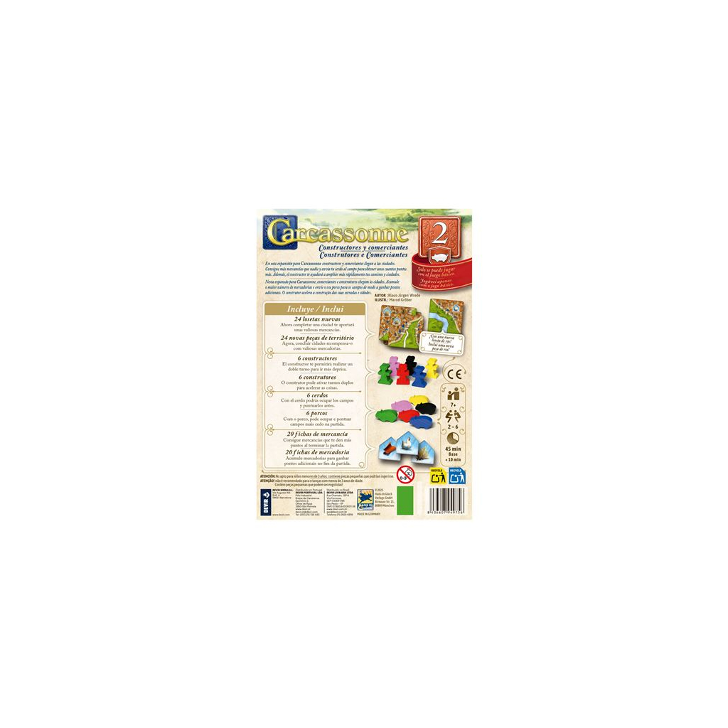 Nesta expansão para Carcassonne, comerciantes e construtores chegam às cidades. Acumule o maior número de mercadorias e envie o seu porco para os campos de modo a ganhar pontos adicionais. O construtor acelera a construção das suas estradas e cidades. Necessário o jogo base.