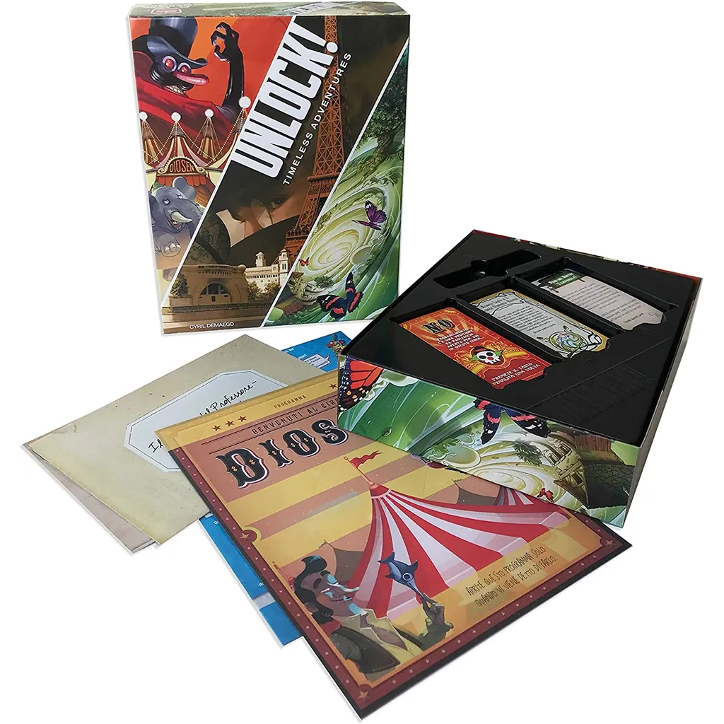 Unlock! is a co-operative card game inspired by escape rooms that uses a simple system which allows you to search scenes, combine objects, and solve riddles. Play Unlock! to embark on great adventures, while seated at a table using only cards and a companion app that can provide clues, check codes, monitor time remaining, etc. The three scenarios are