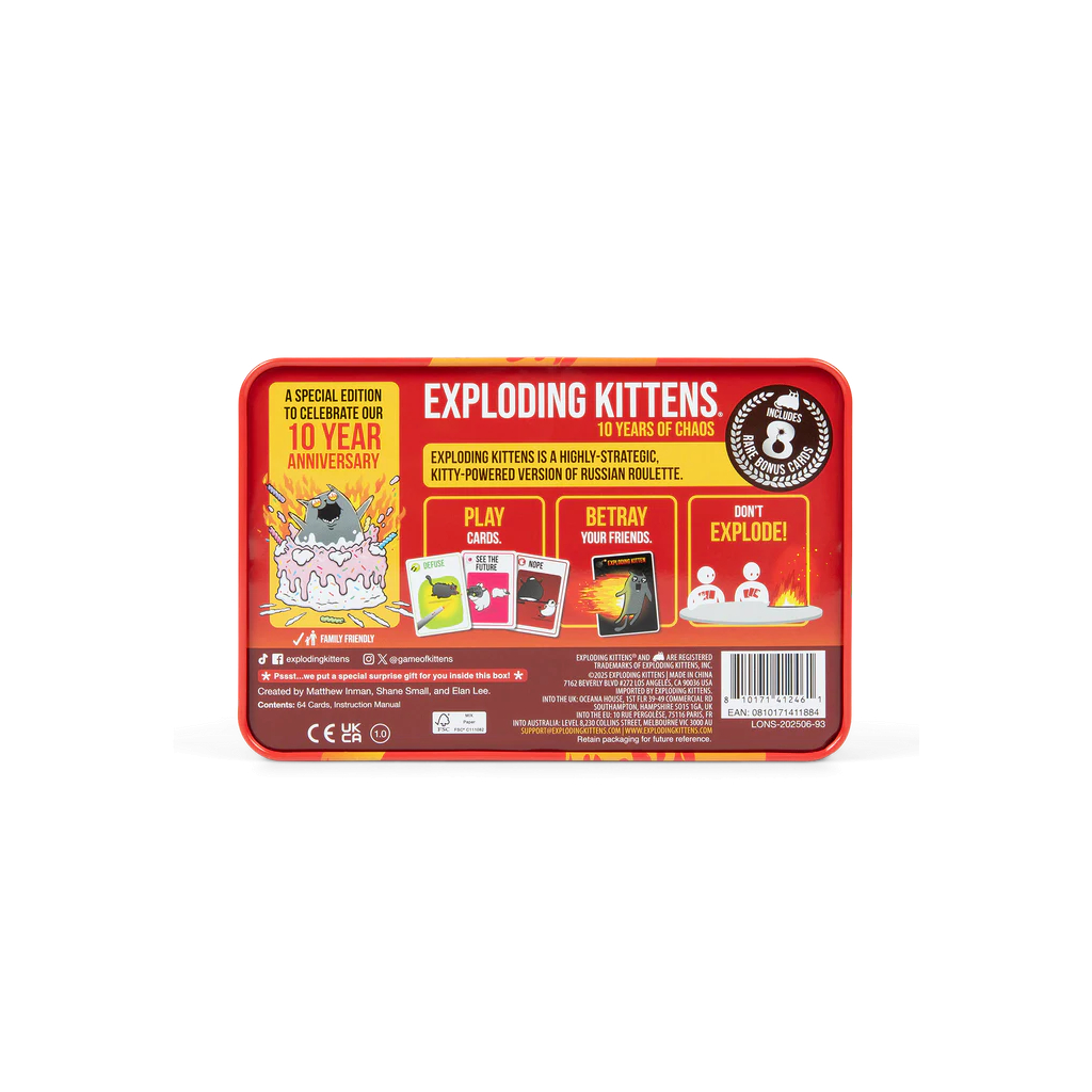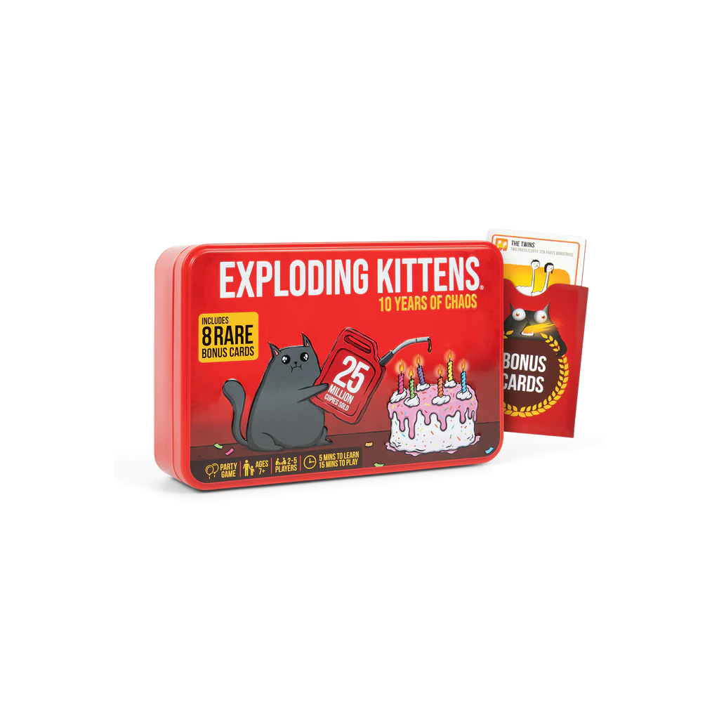The 10th Anniversary Tin comes with 56 cards and 8 rare bonus cards packaged inside our exclusive 10th Anniversary Tin. Whip it out and dazzle your friends in celebration before you cleverly defuse every Exploding Kitten that dares to be drawn!