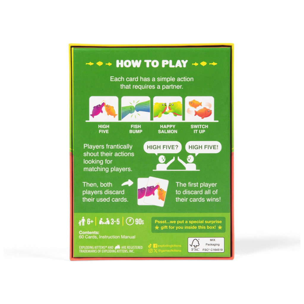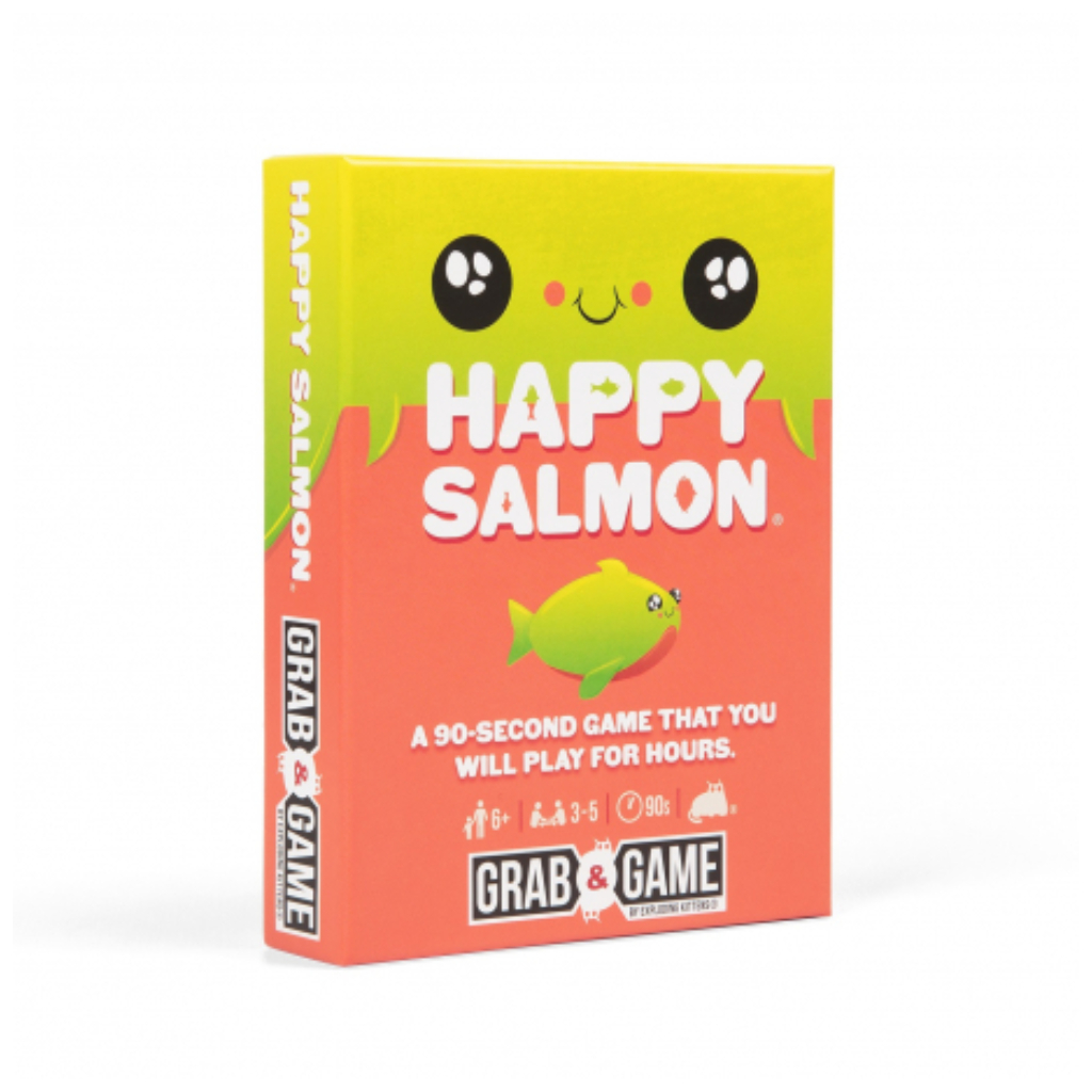 Happy Salmon: Grab & Game Edition is a quick travel game for 3-5 players. Each player gets a stack of cards. Every card has a simple action that requires a partner. Players frantically shout their actions looking for matching players. When they find a match, they both complete the action and discard their used cards.The first player to finish the actions all of their cards wins!