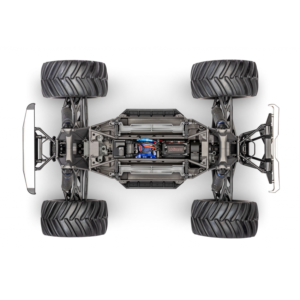 Fully assembled X-Monster Chassis with TQi™ 2.4 GHz Radio System, VXL-8s Brushless Power System, belted chevron tires. Requires MT body (sold separately).